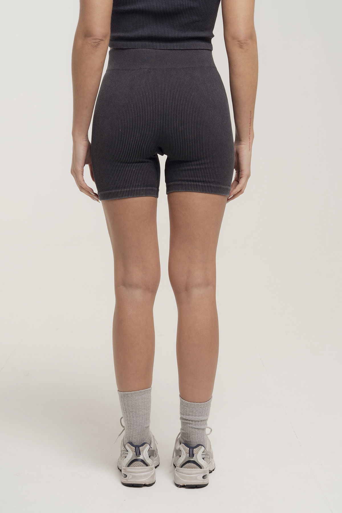 Short sin costuras de morley negro con proceso textil stone wash.Brinda un calce perfecto y se adapta al cuerpo
