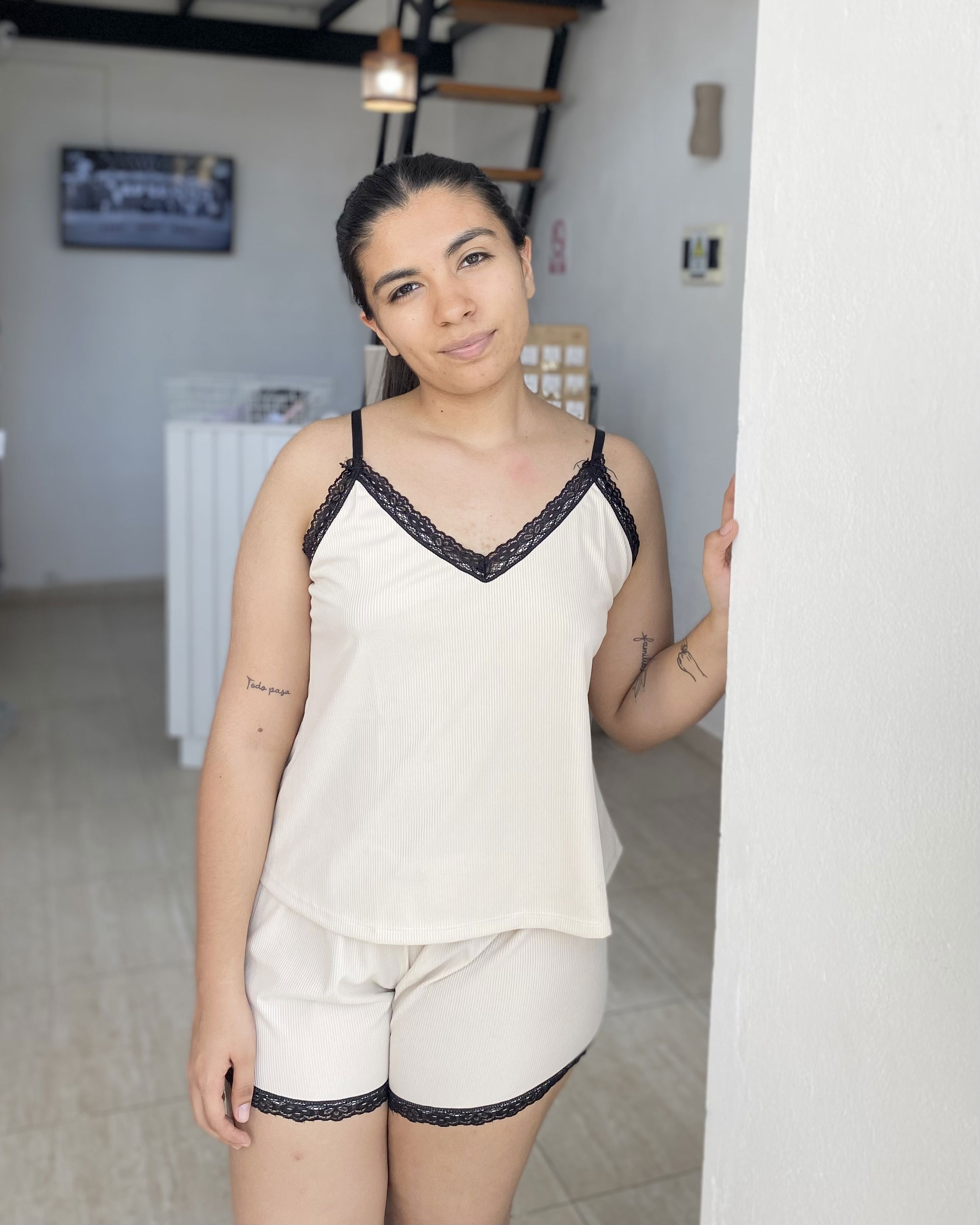 regulables y short , ambos con detalle de puntilla.